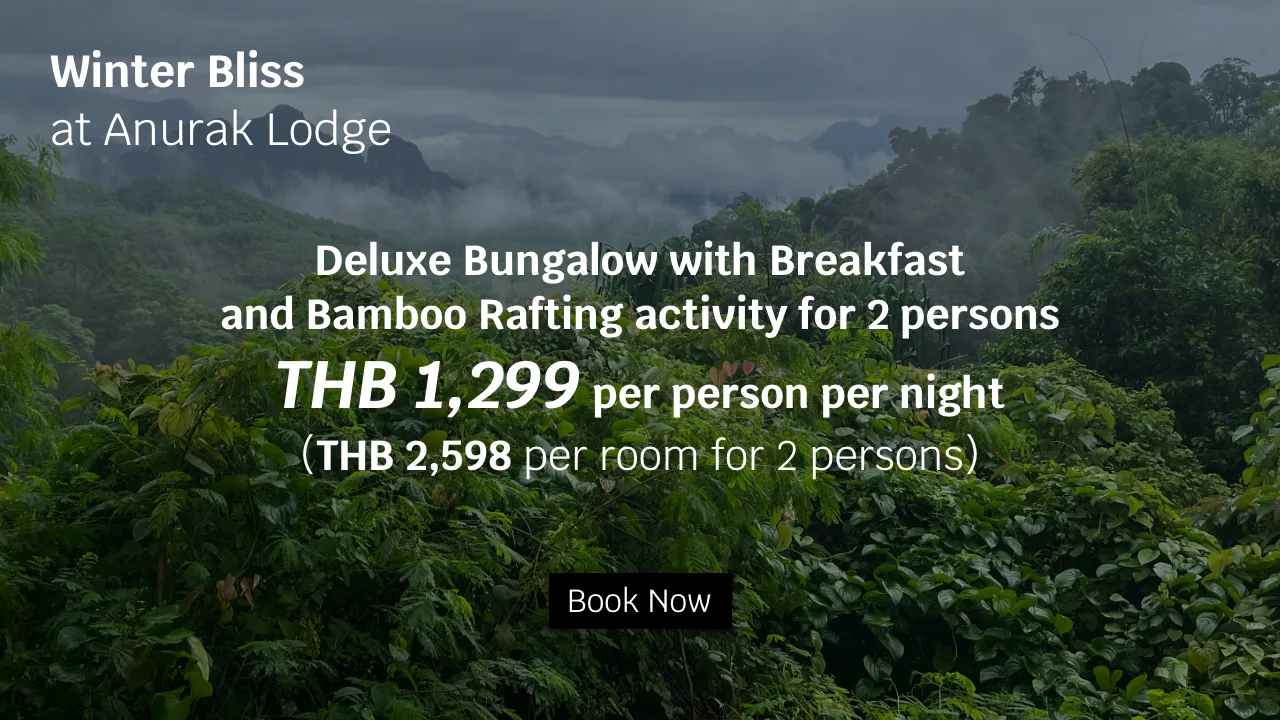 Deluxe Bungalow with Breakfast for 2 persons THB 1,299 per person per night (THB 2,598 per room for 2 persons) FREE! Khao Sok Bamboo Rafting activity for 2 persons Stay: 1 November 2025 – 30 April 2026